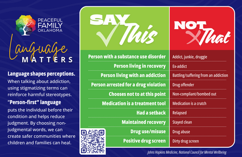 We are grateful for this starting point from the National Council for Behavioral Health. When we practice using "people first" language--language that centers the individual above any of their experiences--we allow space for children to separate the disease of addiction from their loved one and begin to heal.