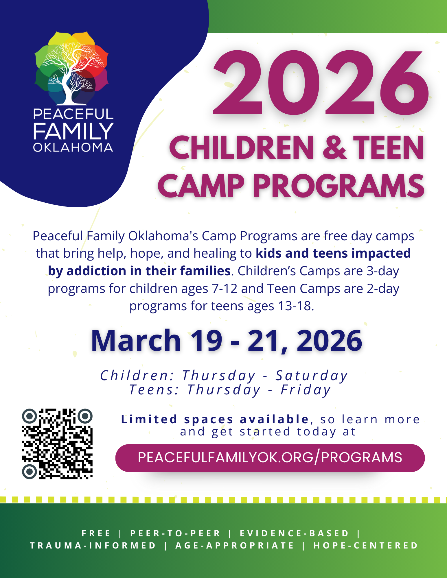 Peaceful Family Oklahoma's Camp Programs are day camps that bring help, hope, and healing to kids and teens impacted by addiction in their families.